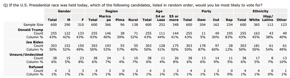 Geographically, Trump is in deep shit, too. Together, Maricopa and Pima Counties are home to about 5.5 million of the state's seven million residents. Trump won Maricopa in 2016, but Martha McSally lost it by five points to Kyrsten Sinema in 2018. (And spoiler alert, she ain't takin' it this time, either!) It is simply impossible to lose Maricopa County by 13 points and win the state's 11 electoral votes.