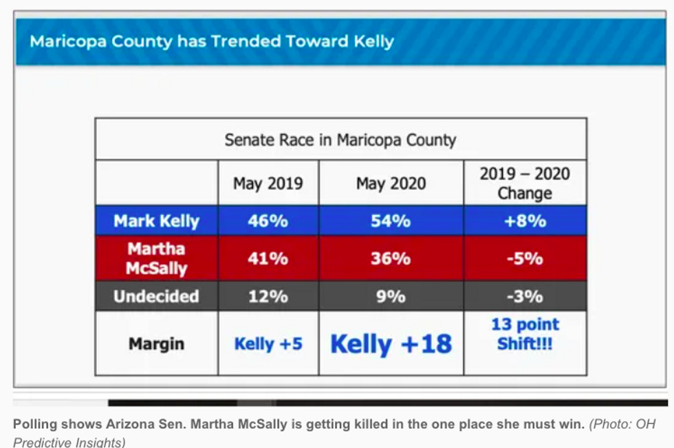 Indeed, the poll has McSally losing to Democrat Mark Kelly, 51 to 38. She's now trailing Kelly by 13 points, even worse than the eight-point margin OH Predictive found last month. And in Maricopa County where they keep all the people — it's WORSE.