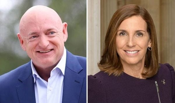 The voters didn't want McSally in 2018 when she lost by about three points to Sinema, a bisexual, ex-Mormon, criminal defense attorney. But Republican Gov. Doug Ducey appointed McSally to the late John McCain's seat and hoped that the voters would warm to her. Apparently they didn't, and now she's up against Gabby Giffords's handsome astronaut husband. So ... lotsa luck!
