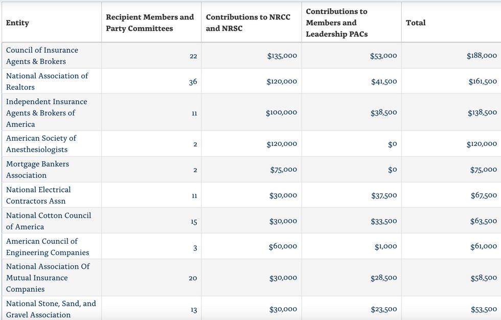 In addition to donations from corporations like Toyota and Koch, the insurrectionist-adjacent members of Congress also got some very nice donations from industry groups, notably three representing insurance agents, companies and brokers, as well as one representing mortgage bankers. Because hey, who's gonna do better work for them than the most morally bankrupt members of Congress?