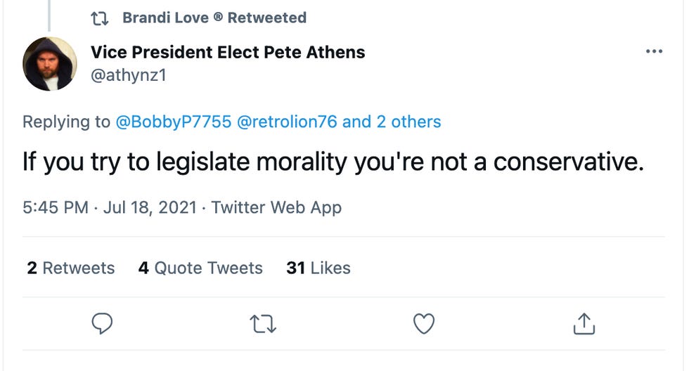 And then there were absolute idiots like this guy who claimed "if you try to legislate morality, you're not a conservative."