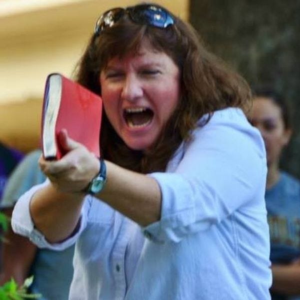 Angela has many more videos of her "open air preaching," by the way. This is her whole thing that she does! That and holding the bible up like a gun and Jesus-shooting all the bathroom sex havers. We look forward to following her work.