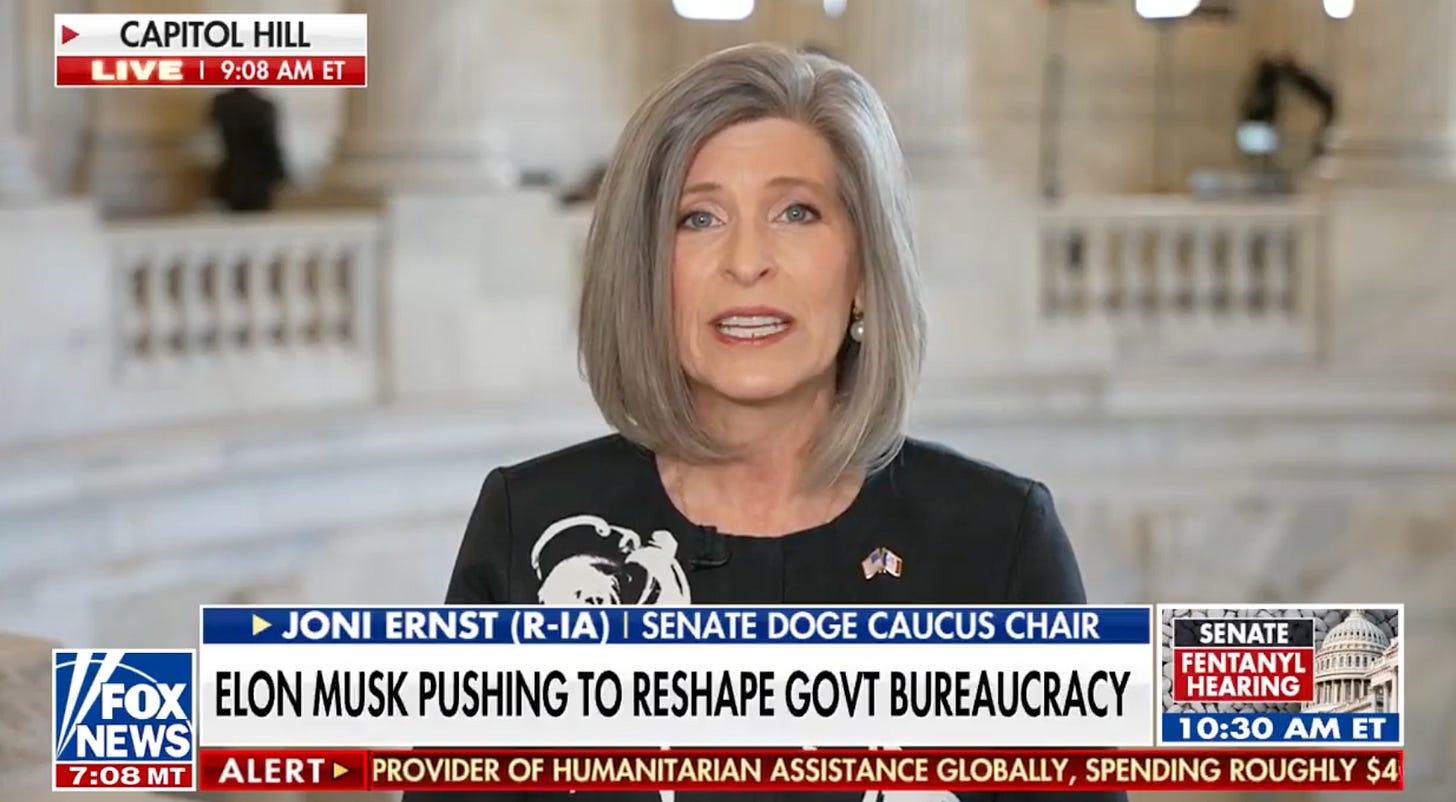 Ernst’s response? “Now or never.” Senator Nazi McBreadbags — who recently canceled out all the work she’s ever done to fight sexual assault in the military, and also canceled out any claim she ever had to caring about the military, by shepherding the confirmation of Pete Hegseth, who’s been credibly accused of rape and otherwise abusing women and so much more! — also went on Fox News to say that “The Democrats need to get used to this” and “Get used to disruption” and also some weird babbling about how the American people don’t care how fast shrimp can run on treadmills. (It’s that thing Republicans do where they find something in a scientific study that sounds funny by itself, especially to the livestock-humping inbreds who make up the MAGA base, to demonstrate “fraud and abuse.”)