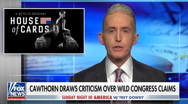 Trey Gowdy got on Fox News the other night, and the former GOP rep from South Carolina had some WORDS for this little first-term shitbird talkin' out of school about XXX caucus meetings and whatnot. Yew wanna name some names, Madison? If yew name some names, Trey Gowdy'll investigate it 58 times like he investigated Benghazi, but yew better name some names!