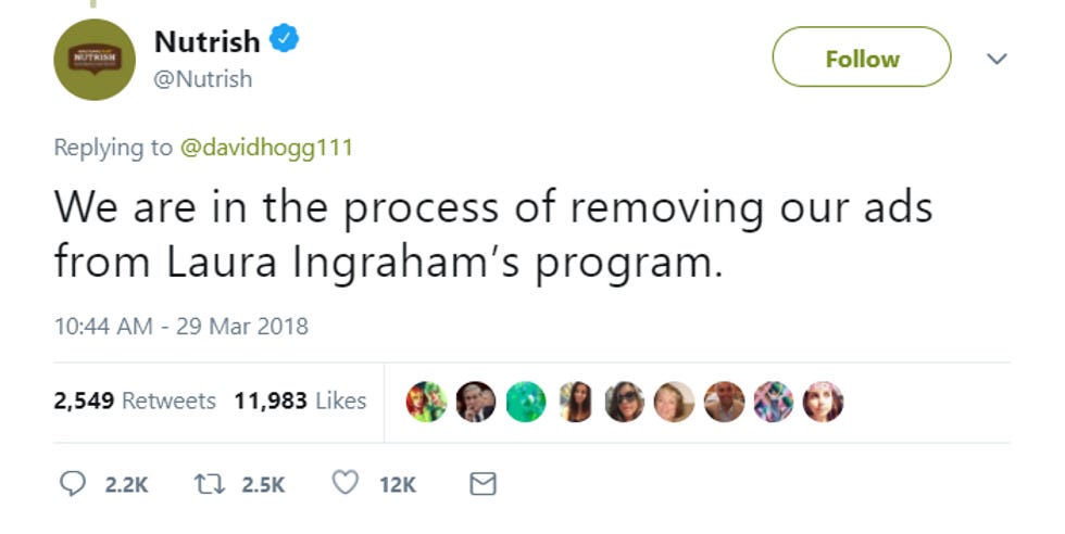 Get to it, COMPANIES! Make like a Nutrish and delete Laura Ingraham!