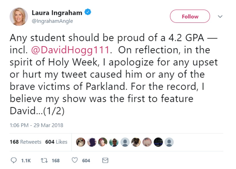 Oh FUCK OFF. "In the spirit of Holy Week"? Jesus didn't die on the cross so Laura Ingraham could be a fucking dick to a child and then say sorry when advertisers start running. And she wants to talk about David Hogg's "poise"? The newly risen Jesus gonna be POISED to break His holy foot off in Laura Ingraham's ass for using His name in vain like that.
