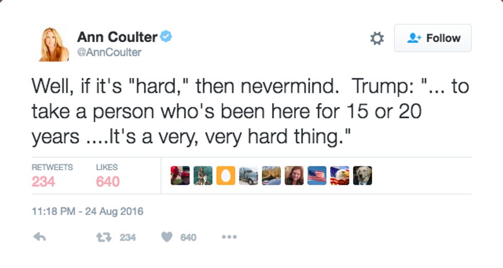 Yes, just as Ann released her book, "In Trump We Trust" -- about how we should all just trust Donald Trump to do whatever -- Trump broke that trust and destroyed her beautiful dream of getting to watch all 11 million undocumented immigrants in this country tossed out like so many DJ Jazzy Jeffs.