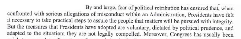 He yam the law, and that's all there is to it. Elsewhere, Barr refers to the "disastrous experimentation with an 'independent' counsel statute" and notes that both parties "agreed to purge" such horrors from our legal system, which certainly would have impressed Trump if he was told about it. If a president is bad, well then elect another one or impeach the bad president if needed, Barr argues. As for investigations into presidents' behavior, that's mostly just a matter of being nice, not the law: