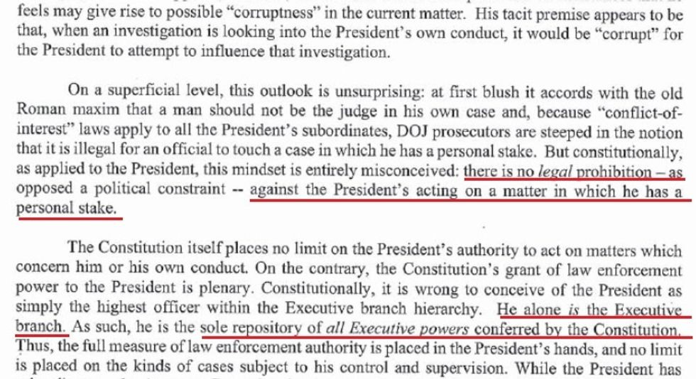 If embraced by the department, this theory would have potentially disastrous implications, not just for the presidency, but for the executive branch as a whole and for the department in particular [...] All that is needed is a claim that a supervisor is acting with an improper purpose and any act arguably constraining a case — such as removing a U.S. attorney — could be cast as a crime of obstruction.