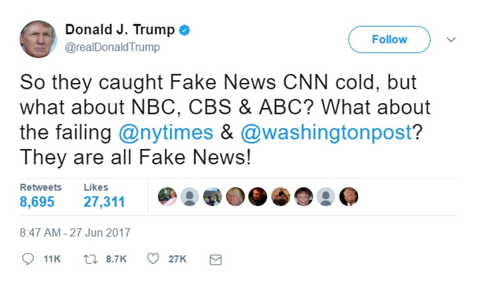 Right, everything is Fake News, and if we wanted to be smart like Trump, we'd just watch Fox News and read Breitbart and the National Enquirer , followed by an Alex Jones Trucker Speed chaser.