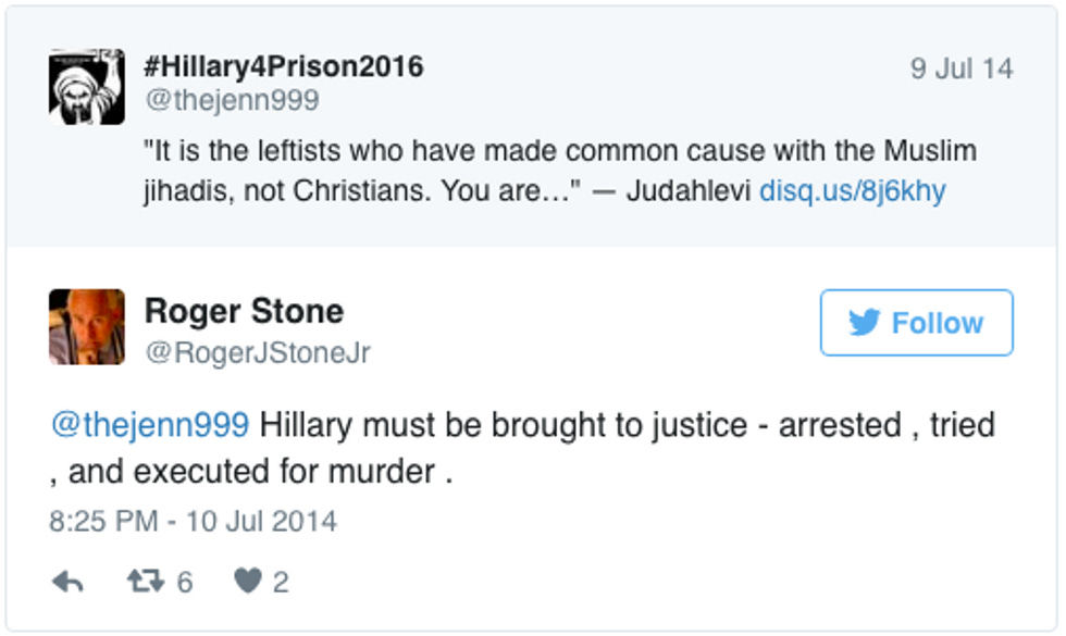 As ThinkProgress notes, he's not the first member of the Trump team to call for Clinton's death. In 2014, Roger Stone said the same thing: