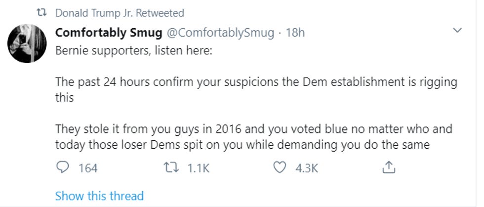 Donald Trump knows what is happening in the Democratic primary, because he is the good kind of pundit, like Chris Cillizza. And he is pretty sure (???) he wants to run against Bernie Sanders in the general, because "socialist," and because somehow he has gotten the message ( from Russia ) that the very best thing for him would be for Democratic primary voters to have a bruising contest and hate each other, therefore he wants to foster conspiracy theories that the establishment is committing a #rigging against Bernie Sanders and stealing the nomination from him. Trump and Russia think average Sanders voters are very stupid, we guess.