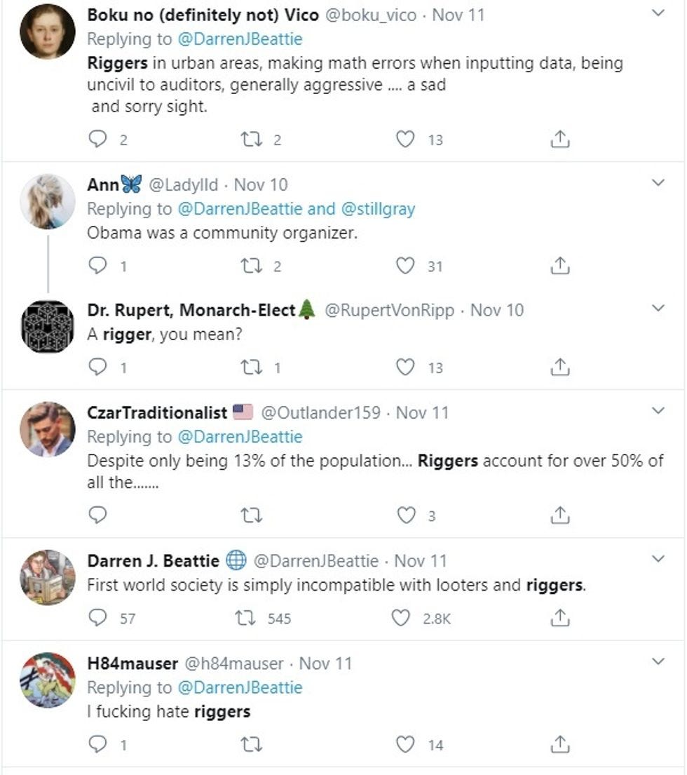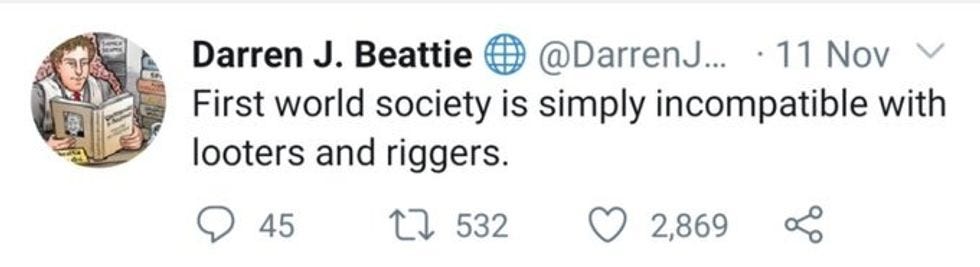 Oh, yes, and last week, Beattie joined in all the rightwing Twitter fun about how Black people aren't fit to govern themselves, because they RIG the elections, and he really didn't mean anything more than saying he doesn't like RIGGERS, GET IT?