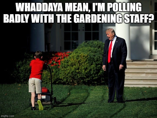 We know that President 200 Deals must have blown out his colon like it was a SpaceX rocket disintegrating over the Bahamas when he saw these poll numbers, because as ever, he disgorged all the bile and insecurity into a post on his vanity social media site, TruthSocial.