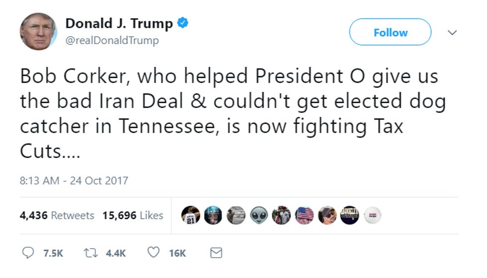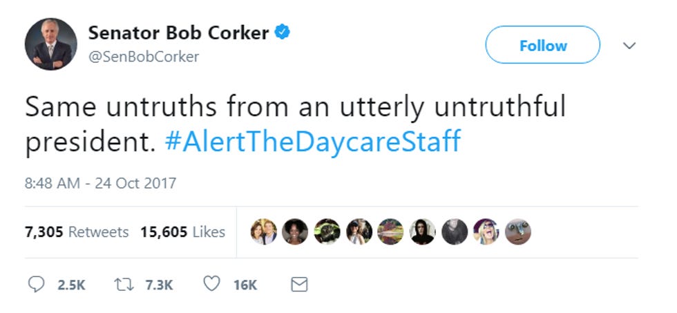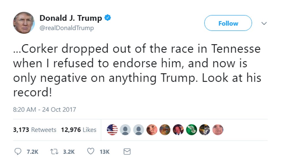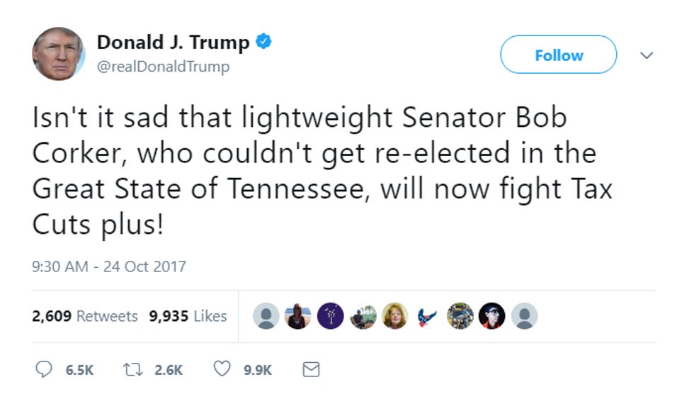 Oh no, everyone! Breaking Twitter news! Trump saw Bob Corker's mean tweet and had to respond with a zinger!