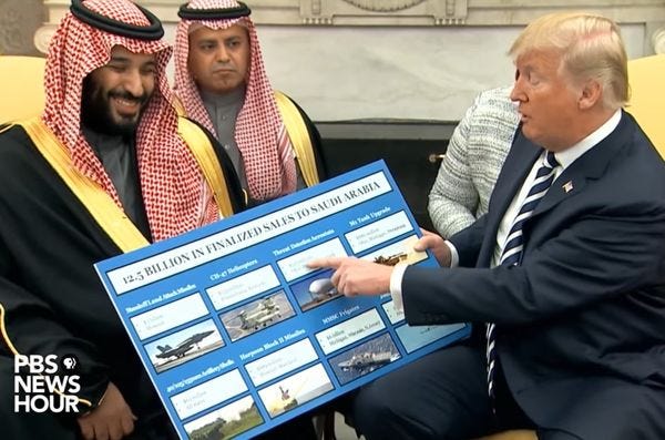 And here's the tell, kids: Trump believes MBS's denials because the Kingdom buys loads and loads of US weapons, and that's the fact that matters most.