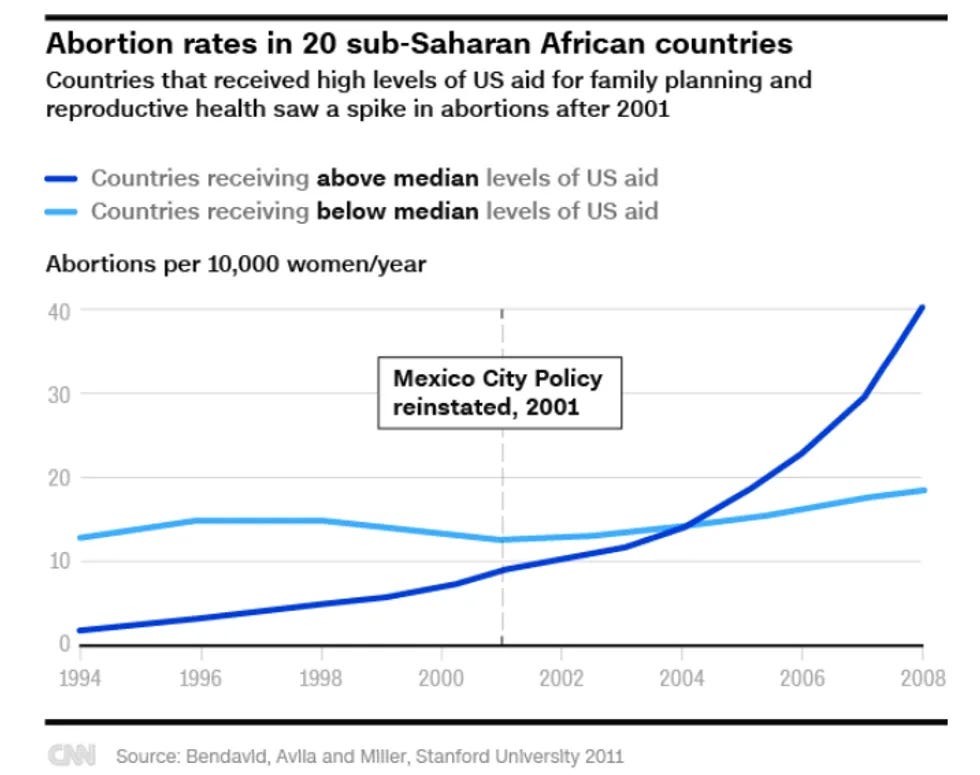 Conversely, the Mexico City policy has historically resulted in an increase in abortions rather than a decrease, for reasons that should be completely obvious to anyone with a modicum of sense. It defunds the family planning programs that provide birth control and other forms of contraception to people in these nations, which then, obviously, increases the number of unplanned, unwanted pregnancies and therefore the number of abortions.