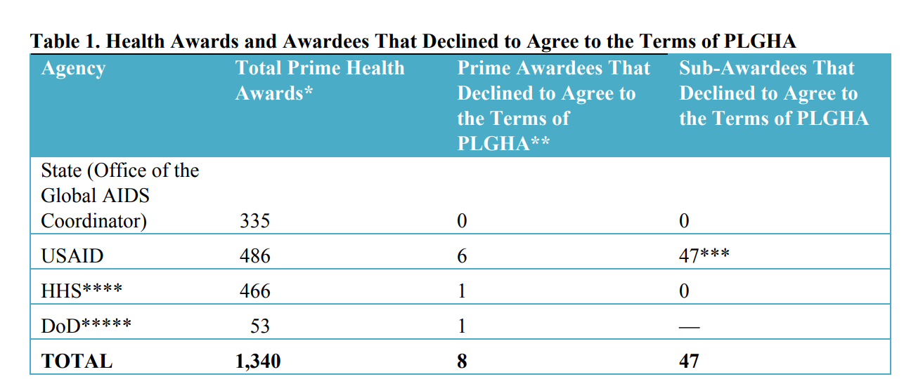 In most cases in which a recipient or sub-recipient declined to agree to the terms of PLGHA, USAID and/or the prime partner successfully transitioned activities to ensure the continuity of global health assistance. Most declinations connected to USAID did not produce a disruption of health care or significant delays in the provision of services. However, USAID found that, in a few cases, the declination resulted in some impact on the delivery of healthcare, including for HIV/AIDS, voluntary family planning/reproductive health, tuberculosis, and nutrition programming.