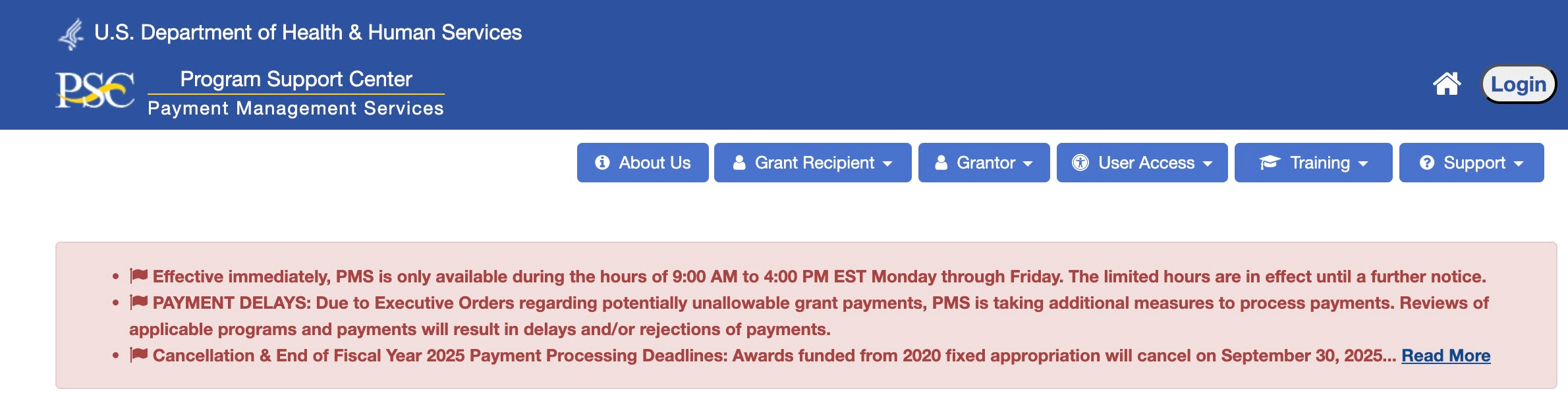Again, NOT HOW ANYTHING WORKS. Leavitt specified that direct payments to individuals would not be affected, but what about reimbursement payments to states for Medicaid? School lunches? Grants to colleges? Who knows! The Payment Management Portals to Medicaid and Head Start were down on Tuesday, with an ominous message: “🚩 PAYMENT DELAYS: Due to Executive Orders regarding potentially unallowable grant payments, PMS is taking additional measures to process payments. Reviews of applicable programs and payments will result in delays and/or rejections of payments.”