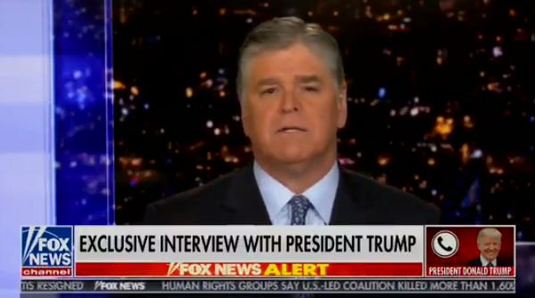 Don't worry, octogenarian Fox News viewers who can't find the clicker and truly believe Hillary Clinton is a murderer! Even during these times of tribulation, as the Fox News judge is telling the truth about Donald Trump's criminality, Sean Hannity is still ready, willing and available to completely cancel the schedule for the rest of his show so he can give Trump a 45-minute tongue bath over the phone.