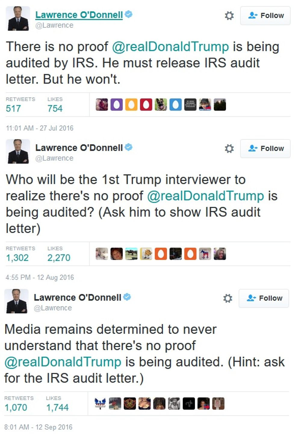 Why, yes. Given the fact that "Donald Trump lied about a thing" is repetitious almost to the point of being like "Airliner lands safely," any assertion Donald Trump makes needs to be backed up by documentation, especially if it's about Donald Trump's finances. So yes, since privacy laws prevent the IRS from saying whether anyone is being audited, then the only one who can prove he's under audit is the guy who got the audit letter. It's a point MSNBC's Lawrence O'Donnell has been making for months, most recently on Twitter Monday: