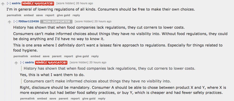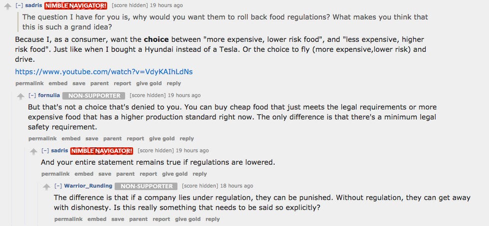 Now, you are probably thinking the Trump campaign got rid of that Food Police bit because, duh, most people do not want to get food poisoning, and are pretty OK with that shit being regulated. And sure, probably most people feel that way. But some Trump supporters could not be more excited about the possibility of unregulated food.