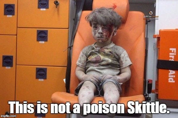 The backlash was so intense that the Trump campaign finally had to respond, clarifying that YES, Syrian refugees are just like if there were some Skittles in a bowl, but three of them had been laced with actual poison, which means you might die if you either eat some of those Skittles or let in some Syrian refugees. And if you don't like that, well, you just can't handle the fucking truth: