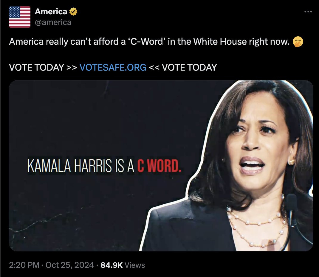 Warning: This ad contains multiple instances of the ‘C Word.’ Viewer discretion is advised. Kamala Harris is a ‘C word.’ You heard that right. A big ole ‘C word.’ In fact, all of the other ‘C words’ think she’s the biggest ‘C word’ of them all. That’s right. She’s a tax-hiking, regulation-loving, gun-grabbing communist. And the worst part? She’s proud of it. Kamala Harris: the ‘C word’ America simply can’t afford. See you nationwide Tuesday, November 5th.