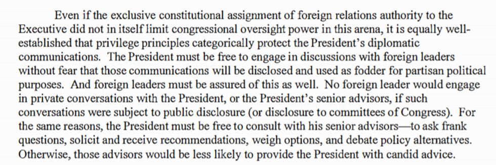 The President must be free to engage in discussions with foreign leaders without fear that those communications will be disclosed and used as fodder for partisan political purposes. [...] No foreign leader would engage in private conversations with the President, or the President's senior advisors, if such conversations were subject to public disclosure (or disclosure to committees of Congress).