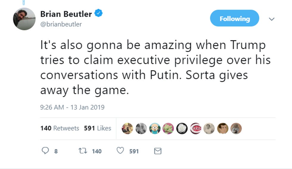 No shit, they really do seem to be claiming executive privilege, over Trump's communications with his real boss, who currently serves as the president of Russia and thus is not on the White House payroll (unless he is and they're hiding that too ). If you need a quick refresher on "Is This Executive Privilege?" before you read further, click here. (SPOILER: It is not.)
