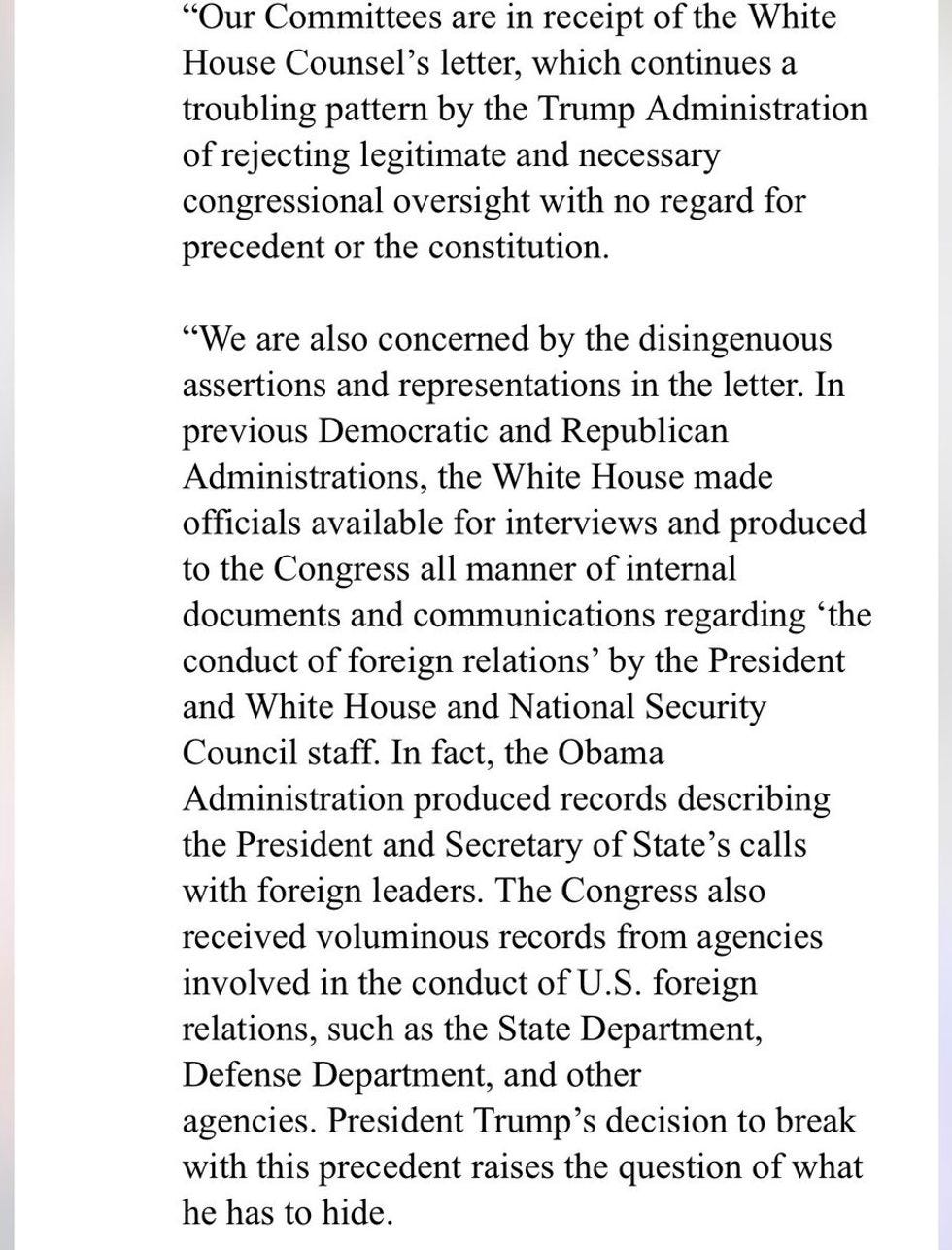 We are ... concerned by the disingenuous assertions and representations in the letter. In previous Democratic and Republican Administrations, the White House made officials available for interviews and produced to the Congress all manner of internal documents and communications regarding 'the conduct of foreign relations' by the President and White House and National Security Council staff. In fact, the Obama Administration produced records describing the President and Secretary of State's calls with foreign leaders. [...]