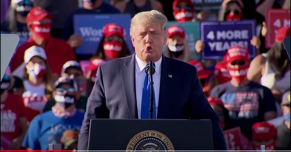 Donald Trump, speaking at a rally in Nevada yesterday -- yes, another rally! he is doing very many of them! in a state he has only a 13 percent chance of winning! -- told a crowd of future Typhoid Marys all about all of the dreadful things Joe Biden will do if elected 0resident of the United States of America.