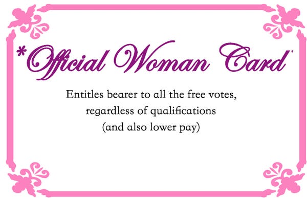 Also, if Woman Cards™ reel in the votes then why did Carly Fiorina not do so well? Or, for that matter, Shirley Chisholm or Carole Moseley Braun?