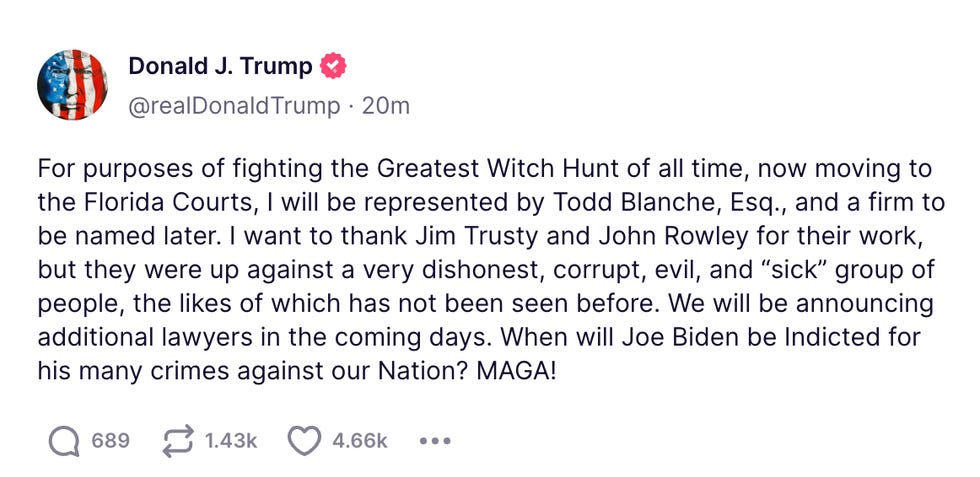 In the meantime, the Wall Street Journal is reporting that Trump's aide Walt Nauta has also been charged in the Trump indictment. Nauta, a valet, is reported to have given multiple different accounts to prosecutors of how he came to be on tape moving boxes in and out of the closet where Trump was keeping the documents he stole from the White House. The Guardian reported yesterday that Nauta's lawyer Stan Woodward has alleged improper conduct by prosecutor Jay Bratt, the head of the DOJ's counterintelligence division.