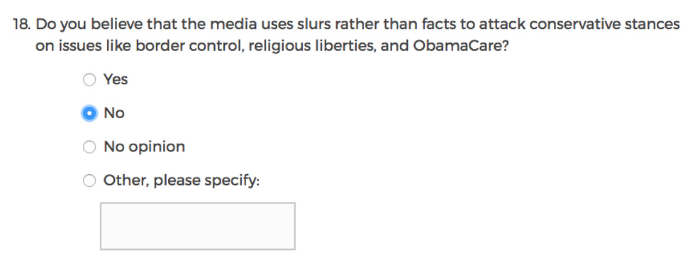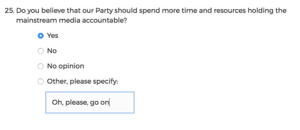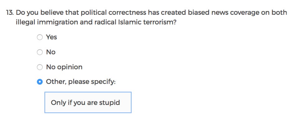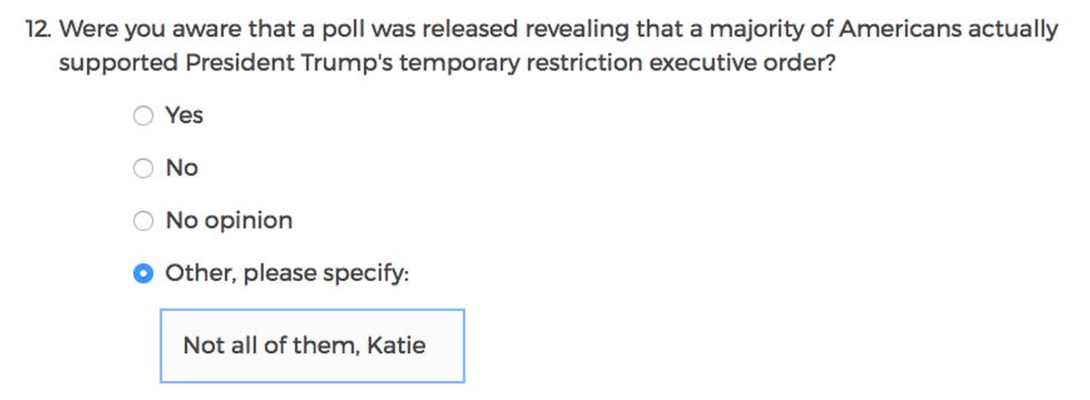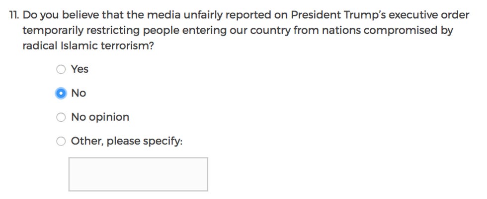 The Trump administration has sent out a questionnaire to people who supported him in the campaign, all about the most important issue of our day -- how the media is unfair to Donald Trump. So they can fill it out and send it back to him, and then he can go "Here! See! Everyone thinks you are unfair to me, neener neener neener, now go do your job and write exclusively about how nice I smell, how big my hands are, how good I am at shaking hands, and how everything is going really great these days for my administration!"