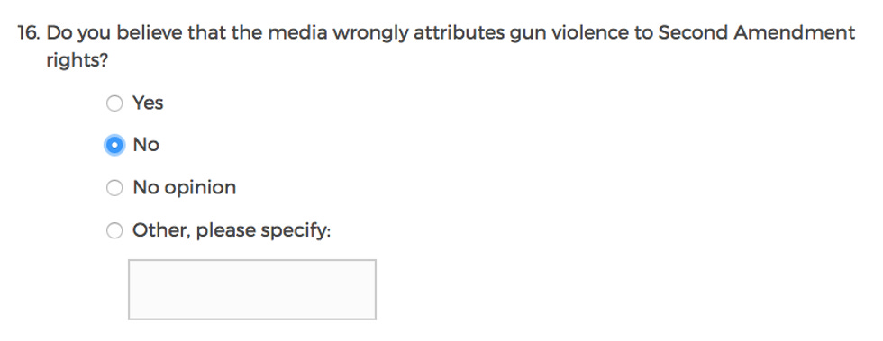 THAT DOESN'T EVEN MAKE SENSE AS A QUESTION. I would love to see them find a straight reported piece in which gun violence was attributed to the Second Amendment. Not an opinion piece, a reported piece. They are the ones who have criticized "the media" for referring to "shootings" as "shootings" because they think that accurately describing what happened makes people not like guns. Calling a shooting a shooting is not "bias," it's accurate.