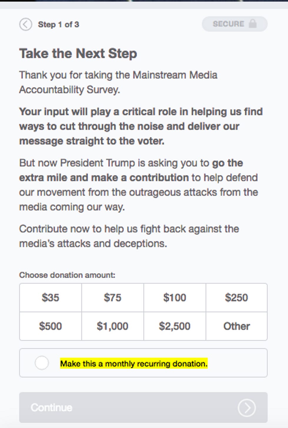 After entering my "information" (not my real information), I was immediately directed to a page asking me to give Donald Trump money in order to fight the "mainstream media."