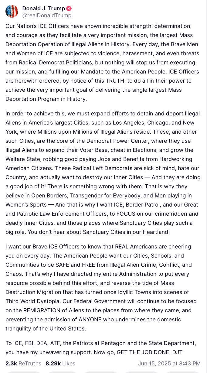 I want our Brave ICE Officers to know that REAL Americans are cheering you on every day. […] To ICE, FBI, DEA, ATF, the Patriots at Pentagon and the State Department, you have my unwavering support. Now go, GET THE JOB DONE! DJT