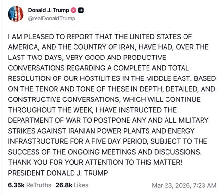 Then Trump put out his big “WE WILL BOMB YOUR POWER PLANTS” tweet on Saturday evening. The overseas markets went batshit, whereupon he probably got a gazillion panicked calls from CEOs and advisers telling him the week would kick off with more steep losses. So first thing Monday morning he did his usual TACO two-step, informing us that peace is almost at hand: