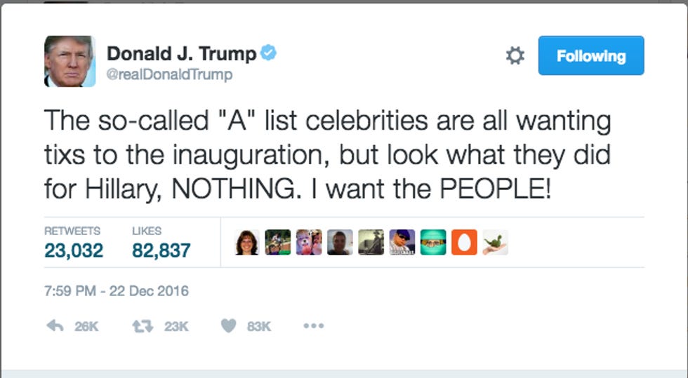 Poor Donald Trump has had a real hard time getting anyone that anyone has ever actually heard of to perform at his inauguration ceremony. Outside of Ted Nugent and Kid Rock and The Mormon Tabernacle Choir, the current line-up includes Jackie Evancho -- who was most notably a runner-up on America's Got Talent back in 2009, a literal wedding band called The Reagan Years that plays '80s cover songs, and The Mixx , which is, I shit you not, the exact same band as The Reagan Years , just playing songs from other eras.