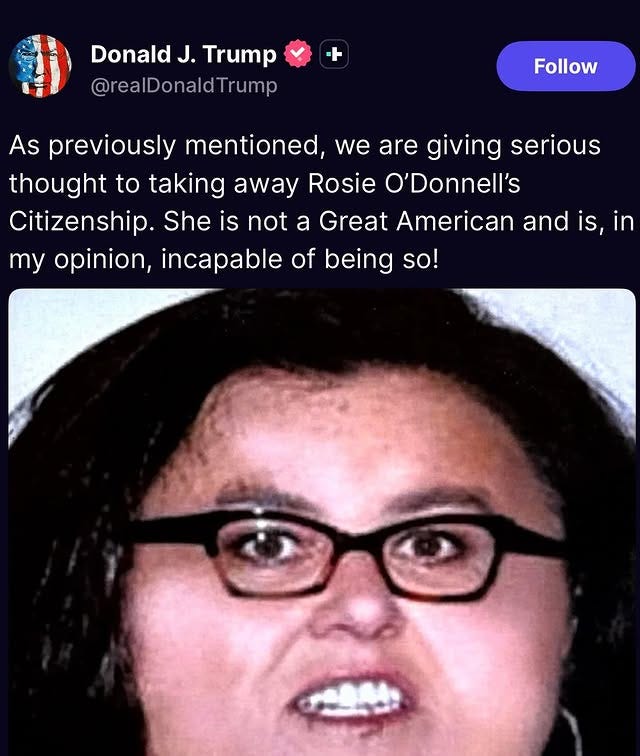 (He still can’t take away Rosie O’Donnell’s citizenship. He is powerless to do that, even if he is fucking Satan.)