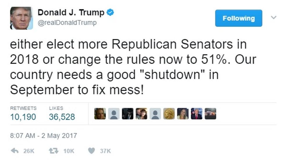 Stupid terrible bill that avoided a shutdown! What kind of moron would sign that? Also, notice the typically Trumpian sense of time: Before September's deadline, America must either elect eight more Republicans in November 2018, or eliminate the legislative filibuster. And what we really need is a good shutdown, which will teach us a lesson, all right.
