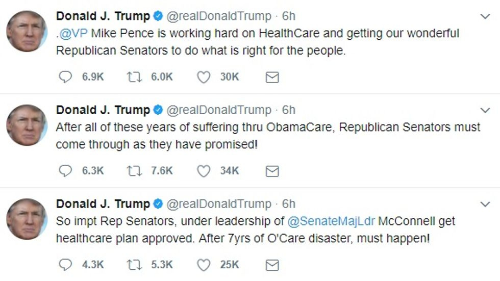 Expect that one to go down the Memory Hole soon enough, not simply because he called the terrific plan "failed," but also becauses ofs the typo abouts "Republicans Senators." Thank goodness the internet never forgets. But that's a guy who really wants you to embrace the Republican healthcare plan, huh? To be fair, the president also had other things to say this morning about why you should look forward to the benefits of this terrific plan for America's healthcare system: