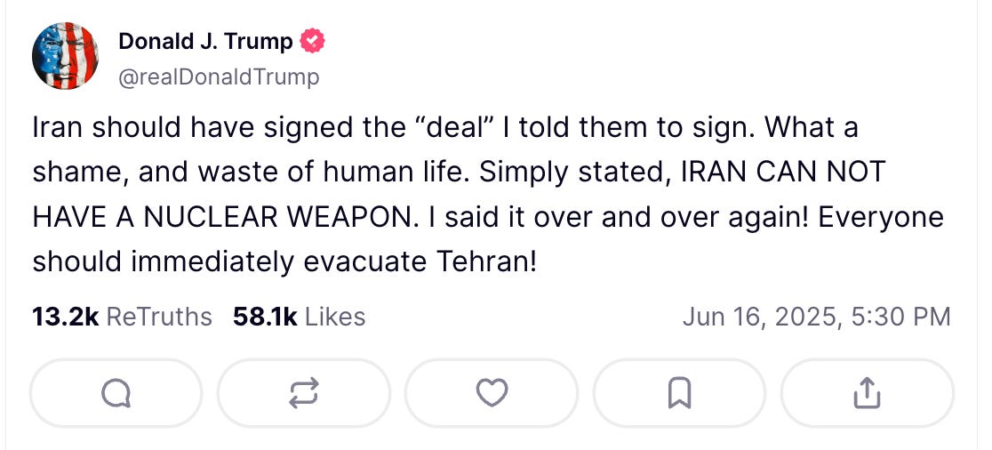 The crisis was apparently himself shitting his pants on Truth Social and telling everybody in Tehran to run away: