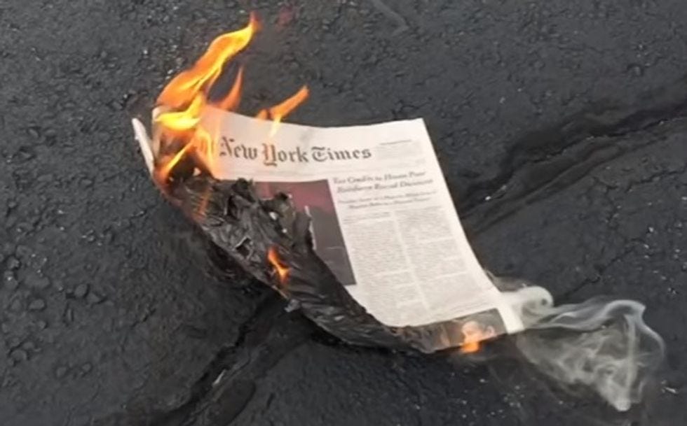 You don't learn that kind of poetry in no university, dawg. Also, look at him symbolically burning a copy of the failing New York Times while rapping "CNN is ISIS, and so is NBC / They all are the Enemy." He had to buy the paper to burn it, so they're probably all kinds of upset.