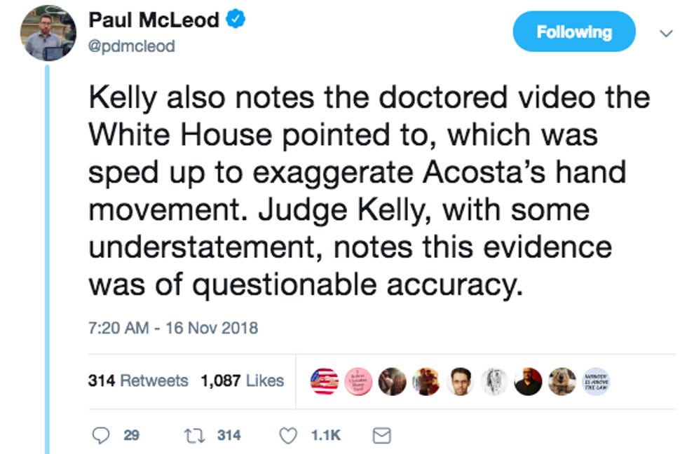 Leave aside for a moment the screaming irony of the Pussgrab Administration lecturing the press on decorum. Literally none of what the Huckster said here is true. Judge Timothy Kelly ordered the White House Press Office to reinstate Jim Acosta's hard pass immediately on Fifth Amendment grounds. He didn't reach the First Amendment issues of press access because he didn't have to.