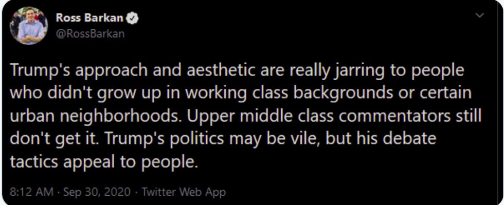 In a quickly deleted tweet, Guardian writer Ross Barkan suggested that people from “working-class backgrounds" and “certain urban neighborhoods" might dig Trump's “debate tactics," which were non-existent. If you set a horse loose in the studio, it might've flustered Biden, but that doesn't make Mr. Ed a forensics champion.