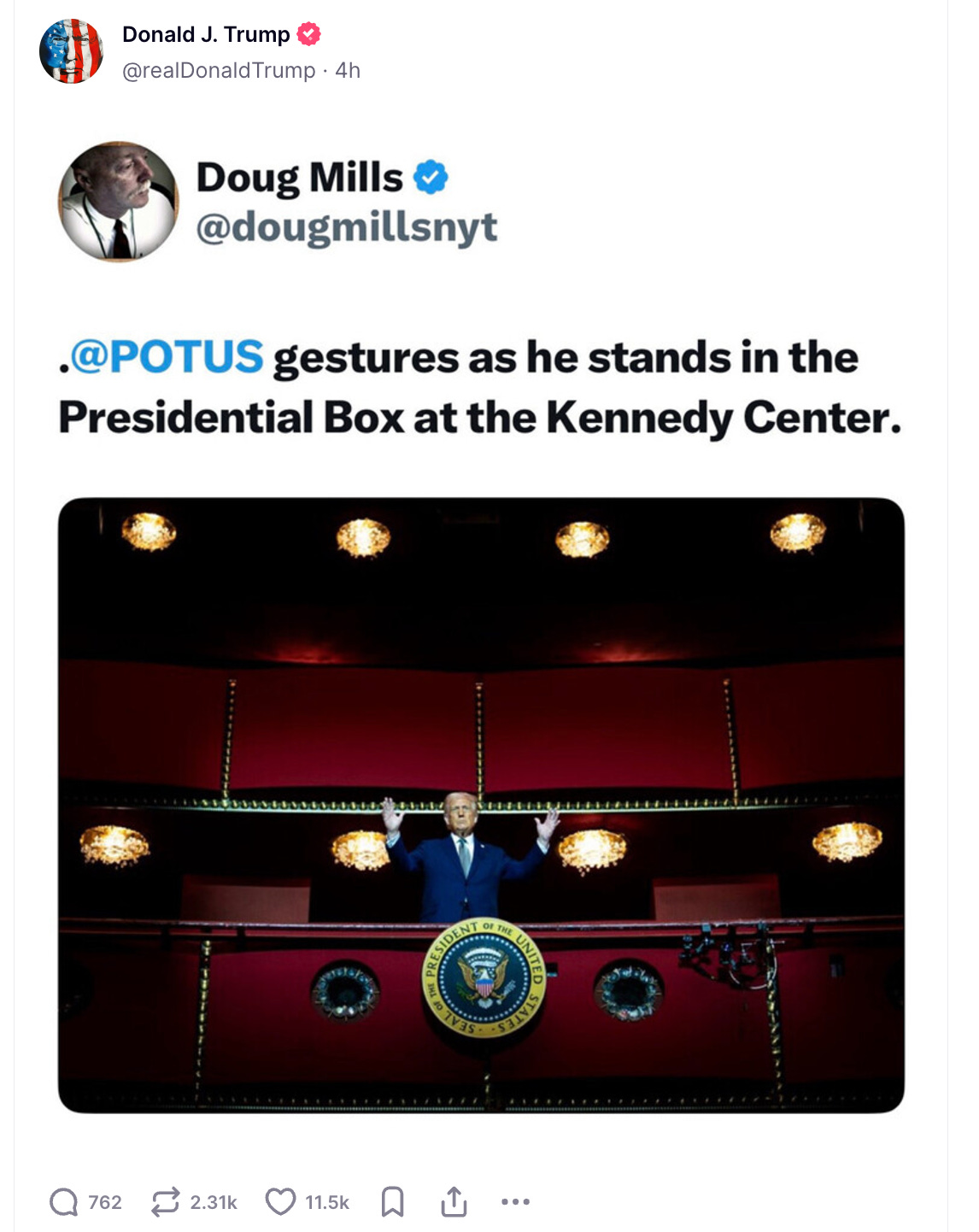 But one must get off the toilet sometime, so this weekend, Trump went to Florida to “win” a golf tournament (dude cheats like crazy) at one of his resorts, and yesterday, Evita Trump went to the Kennedy Center to do a little balcony scene and fix the arts.