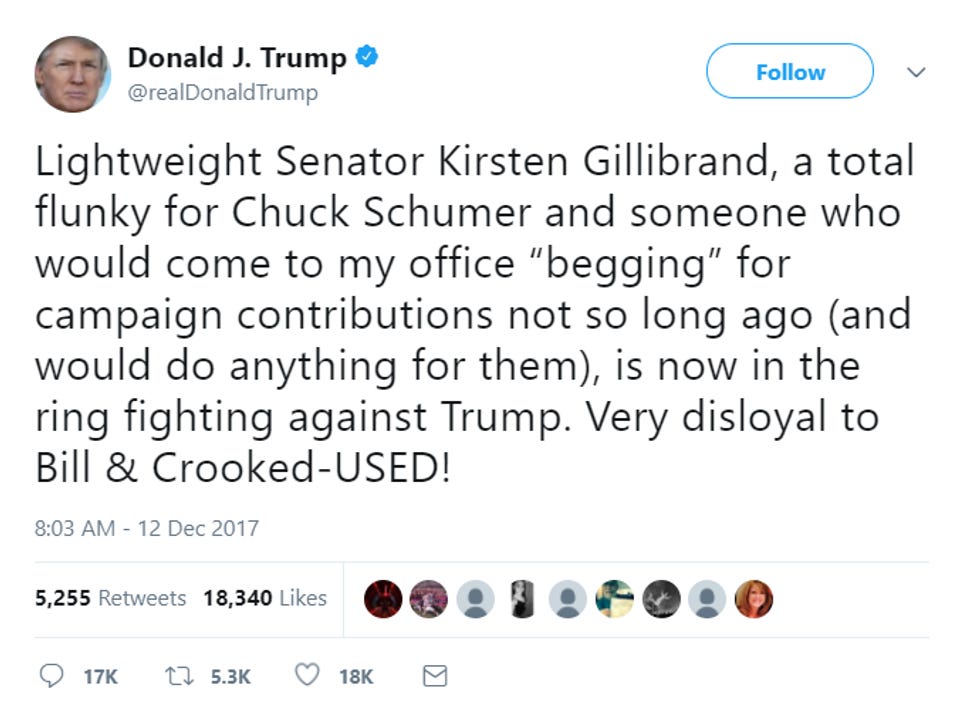 Oh, Donald! You glorious fucking idiot! On the day when Alabama's making its final decision on whether to vote for a sexual predator, a decision that will hinge on turn-out from African-Americans and pissed off women, you LITERALLY TWEETED that the wonderful, highly respected female senator from New York BEGS you for campaign contributions (and would do anything for them, by which you, the president, mean she is willing to fuck or blow you for them). You did this in the middle of the #MeToo awakening, when women are not fucking taking it anymore .