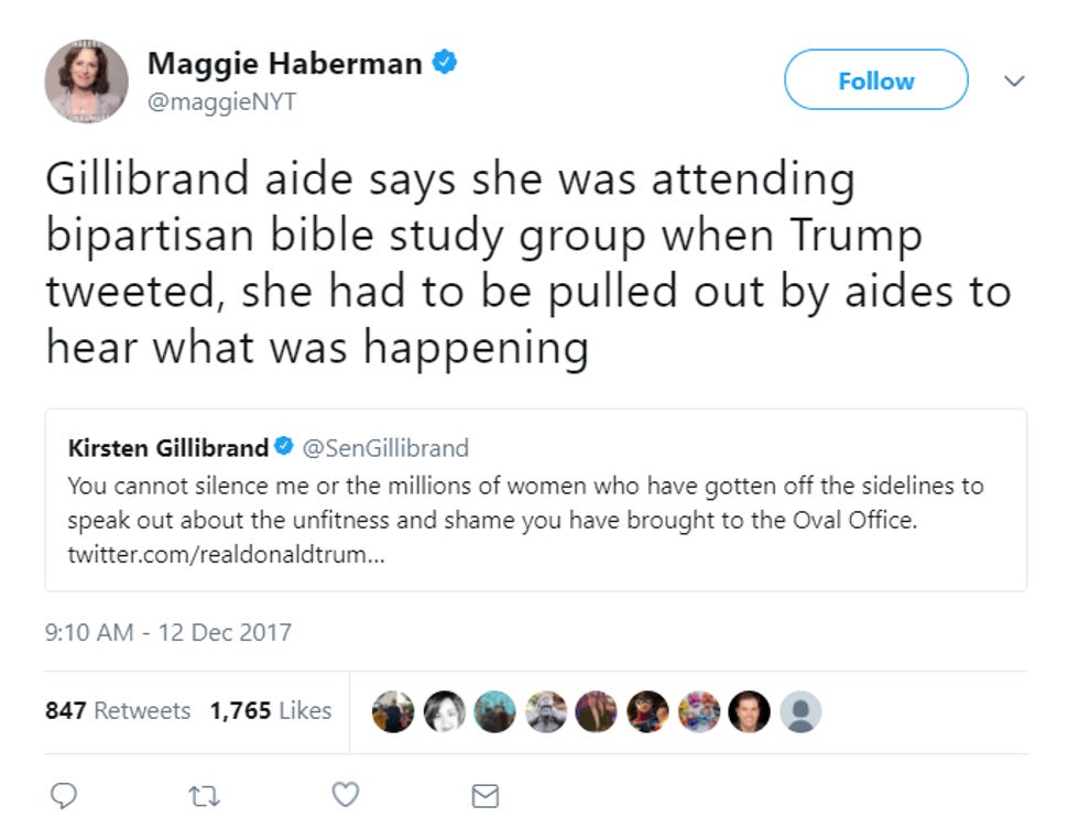 Maggie Haberman gives a little context on what part of Gillibrand's day Donald Trump was interrupting, so she could type that reply on Twitter: